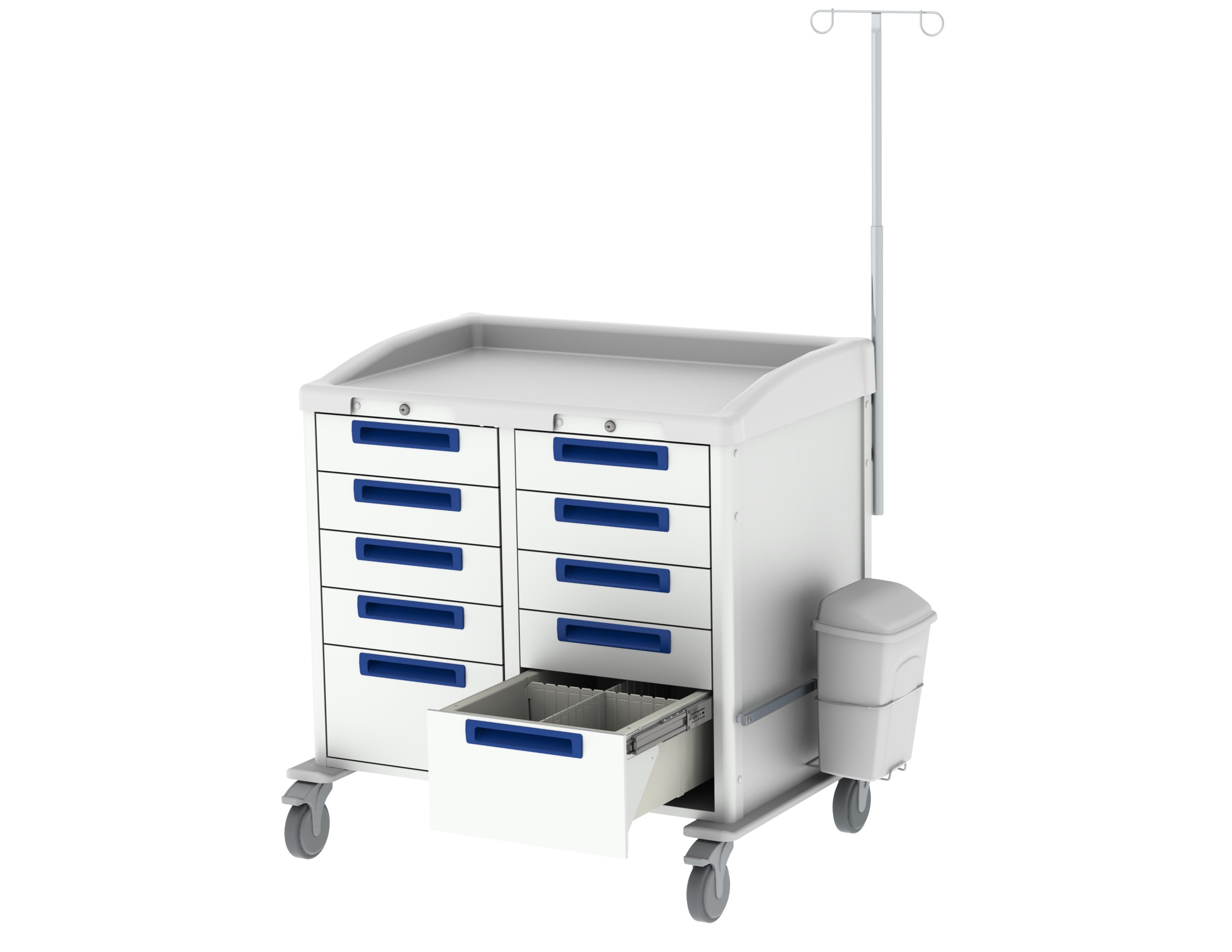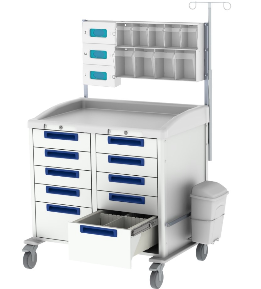 Może służyć jako stacjonarne rozwiązanie na oddziale intensywnej terapii lub oddziale intensywnej opieki medycznej i można go łatwo wymienić na czysty wózek, gdy do sali przybywają nowi pacjenci. Takie mobilne rozwiązania eliminują potrzebę stosowania stałych szafek meblowych, które mogą być trudne w czyszczeniu i stanowić zagrożenie epidemiologiczne.