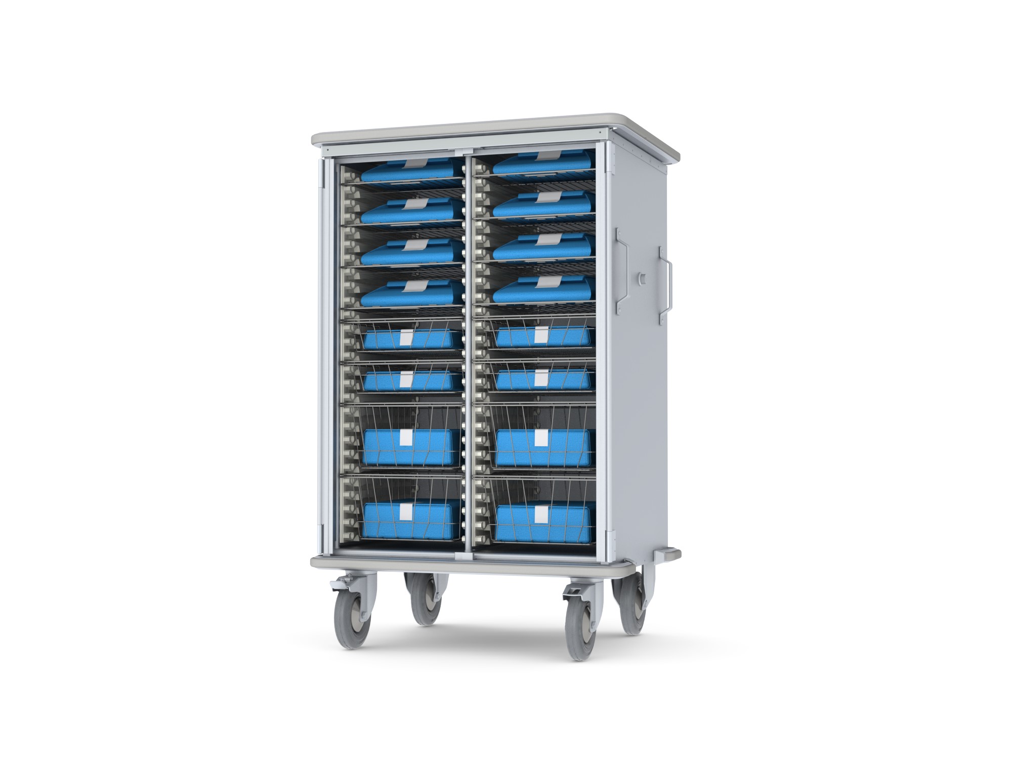 Wózki Hermes o wytrzymałej konstrukcji aluminiowej przeznaczone są głównie do transportu sterylnego i niesterylnego sprzętu medycznego między centralną sterylizatornią a oddziałami przyjmującymi.