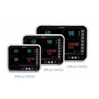 Monitory pacjenta z serii Efficia CM ułatwiają monitorowanie, analizę, rejestrację oraz generowanie alarmów wielu parametrów fizjologicznych przy łóżku pacjenta u osób dorosłych, dzieci i noworodków. Monitory te sprawdzają się również podczas transportu pacjentów na terenie placówki. Monitory pacjenta Efficia CM100, CM120 i CM150 zapewniają informacje dotyczące EKG oraz arytmii, SpO2 (technologia Philips SpO2 lub MasimoI), ciśnienia krwi w pomiarze nieinwazyjnym, częstości rytmu serca, częstości tętna, temperatury w dwóch pomiarach oraz oddechu. W zależności od zamówionych opcji monitory pacjenta mogą również