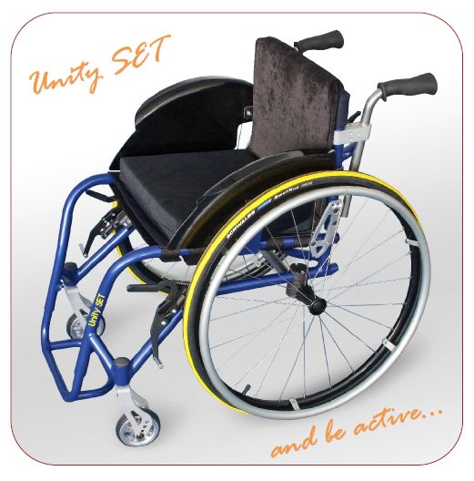 WERSJA PODSTAWOWA 1A. Przeznaczenie: paraplegia, niskie uszkodzenia przy dobrej stabilizacji, amputacja kończyn dolnych. Unity SET to wózek do aktywnej rehabilitacji zaprojektowany tak, żeby zapewnić jak największe możliwości samodzielnego poruszania się. Jest wykonany ręcznie, wg indywidualnych potrzeb użytkownika. Unity SET jest przeznaczony dla osób z dysfunkcjami kończyn, nie posiadających przeciwwskazań do podejmowania wysiłku fizycznego, w szczególności dla osób z paraplegią, tetraplegia i po amputacjach w obrębie kończyn dolnych. Wózek aktywny Unity SET jest dopasowany przez naszych specjalistów wg cech antropometrycznych i motorycznych użytkownika. Dopasowanie dotyczy wymiarów ramy i oparcia, wymiarów i rodzaju innych podzespołów (koła tylne, przednie kółka samonastawne, hamulce, tapicerka siedziska i oparcia, podnóżek itp.) oraz doboru wyposażenia dodatkowego (podpórki antywywrotne, rączki do pchania wózka itp.). Biorąc pod uwagę wszystkie opcje wymiarowe i wyposażenia w praktyce nie ma dwóch identycznych wózków - Unity SET. Rama Unity SET-a charakteryzuje się dużą sztywnością i wytrzymałością mechaniczną. Nie rozprasza energii podczas jazdy, jest wykonana z cienkooeciennych rur duraluminiowych o wytrzymałości właściwej zbliżonej do stali, jej konstrukcja zapewnia niewielki ciężar połączony z dużą sztywnościa niezbędną podczas intensywnej, codziennej eksploatacji. Opis wózka: rama wykonana z wysokowytrzyma3ego stopu aluminium; składane oparcie z regulacją pochylenia; regulowana sprężystość oparcia i siedziska; koła aluminiowe 24” mocowane na osiach szybkozłącznych; koła przednie 4” i 5”; płynna regulacja środka ciężkości; płynna regulacja wysokooeci podnóżka; waga wózka ok. 9 kg (w zależności od szerokości siedziska); różne kolory. Wyposażenie dodatkowe: rączki do prowadzenia wózka; hamulec centralny; ciągi kół pokrywane PCV i silikonem; osłony kół; koła przednie aluminiowe 3”, 4”, 5”; koła napędowe sportowe; możliwość dostosowania wózka dla osób porażonych jednostronnie (HEM).