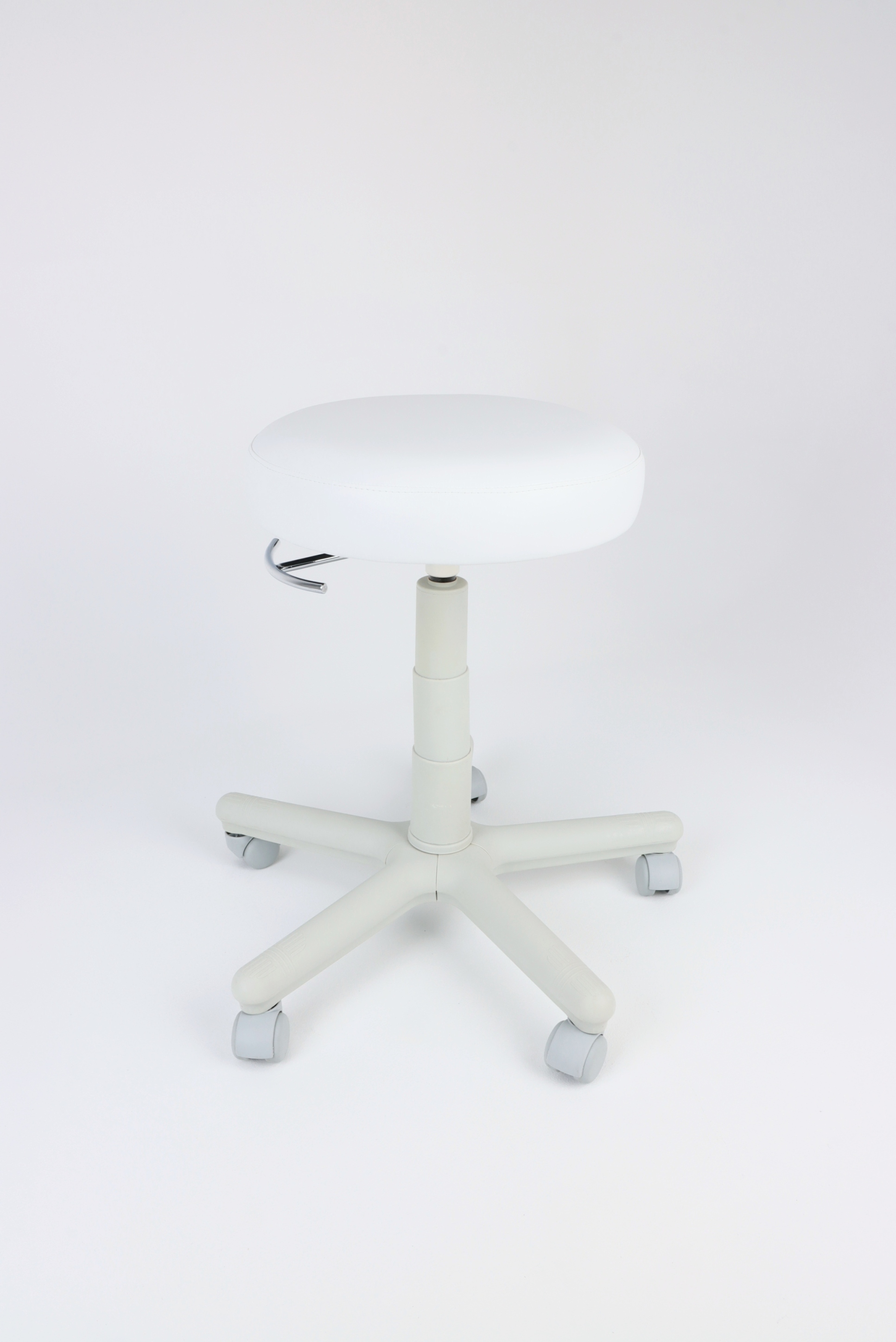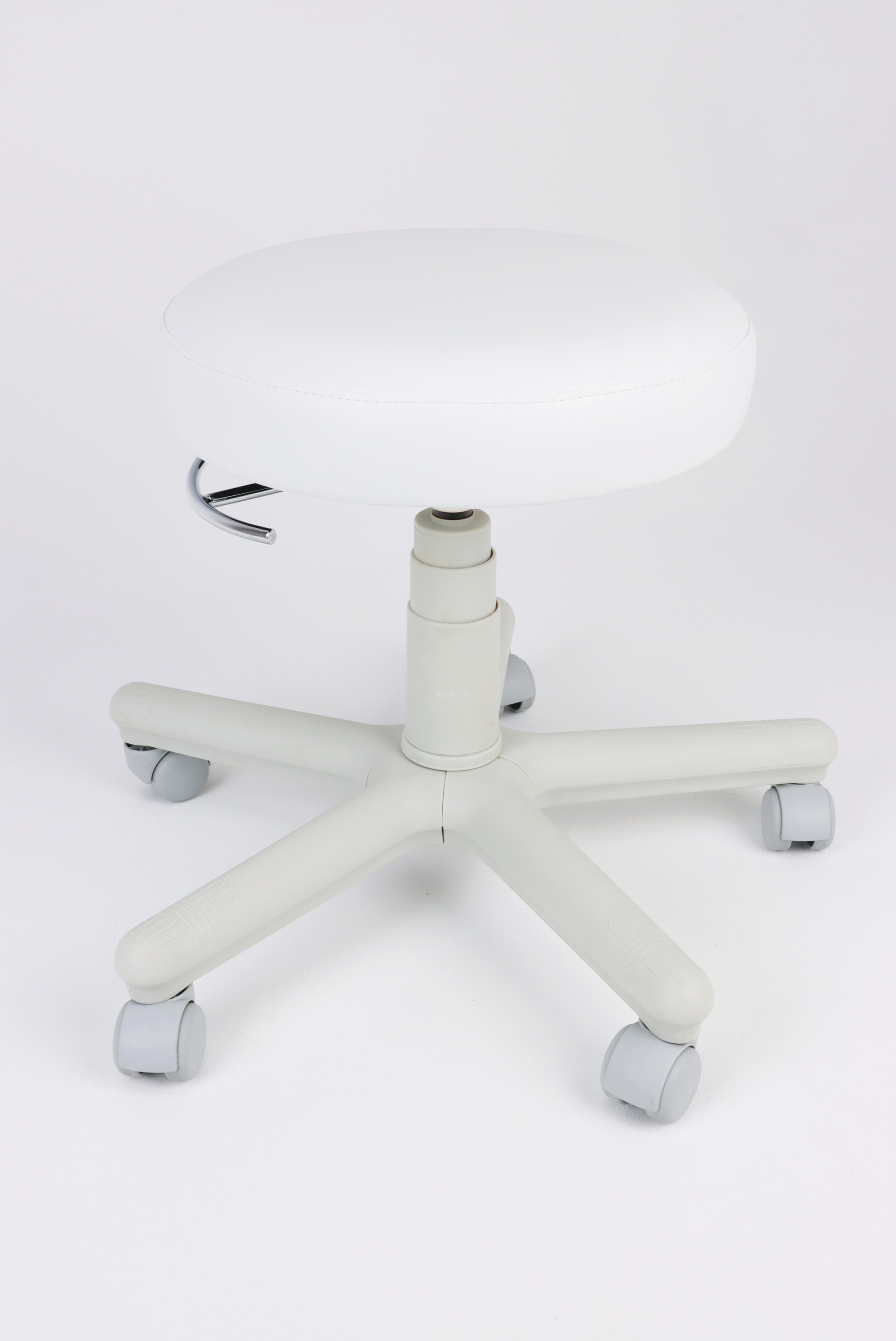 - Taboret Praistech wyróżnia się stabilną, białą konstrukcją i dużym siedziskiem,