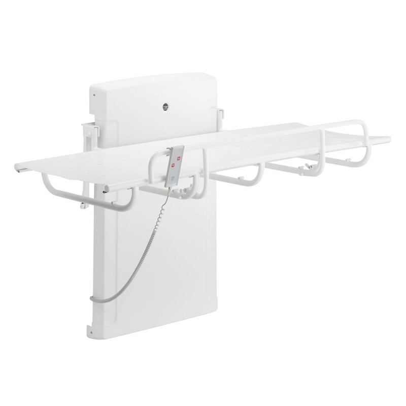 Regulacja elektryczna z przewodowym sterowaniem ręcznym - czerwone przyciski wyraźnie wskazują „Up” i „Down”. Przewodowy sterownik ręczny jest wyposażony w uchwyt do montażu na ścianie. Zintegrowane sprężyny gazowe umożliwiają złożenie stołu, gdy nie jest używany, aby zmaksymalizować powierzchnię podłogi przed urządzeniem. Kurtyna rozbryzgowa (opcjonalna) do prysznica i przewijaka chroni opiekuna przed zachlapaniem.