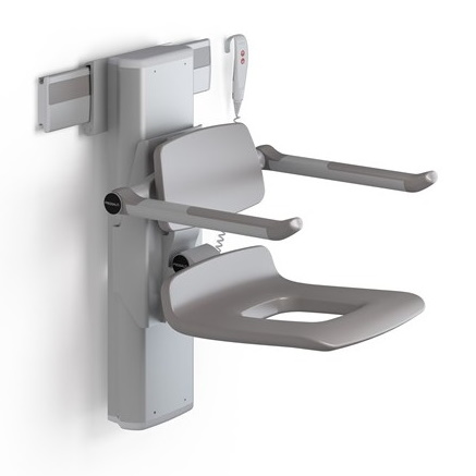 Siedzisko prysznicowe PLUS 450 z regulacją elektryczną, otworem, podłokietnikami, oparciem, panelem poprzecznym