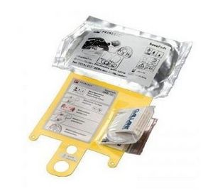 Komplet elektrod w zestawie z maseczką do RKO, nożyczkami, parą rękawiczek oraz maszynką do golenia.