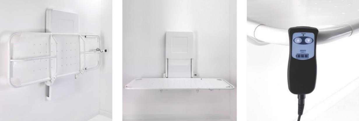 Nosze prysznicowe z elektrycznym podnośnikiem zostały zaprojektowane, aby pomócz łatwością podnieść użytkownika w górę lub w dół. Elektronicznie sterowane z zakresem podnoszenia 500mm, co daje bezpieczną i korzystną wysokość roboczą w celu uniknięcia ryzyka wystąpienia urazów kręgosłupa u opiekuna. Dyskretne i neutralny design sprawia że pasują one do różnych pomieszczeń. Potrzeba mocowania noszy do podłogi została wyeliminowana, co czyni je idealnym wyborem dla obszarów, gdzie rodzaj podłogi uniemożliwia instalację okablowania. Nosze zostały wyposażone w elektryczny podnośnik co zmniejsza wysiłek potrzebny do ich składania. Kompaktowa konstrukcja oraz możliwość ich składania, kiedy nie są użytkowane, sprawia że jest to idealny produkt gdzie istnieje ograniczona przestrzeń.