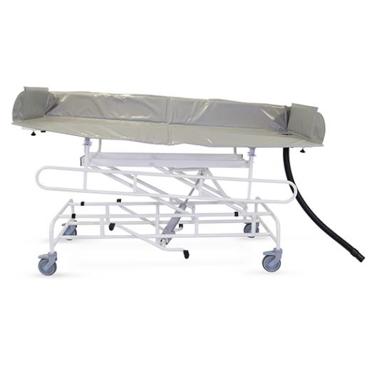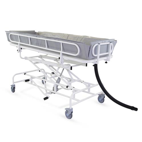 Wózek prysznicowy z regulowaną wysokością za pomocą pompy hydraulicznej, z rurą odpływową i wyścielaną wkładką.