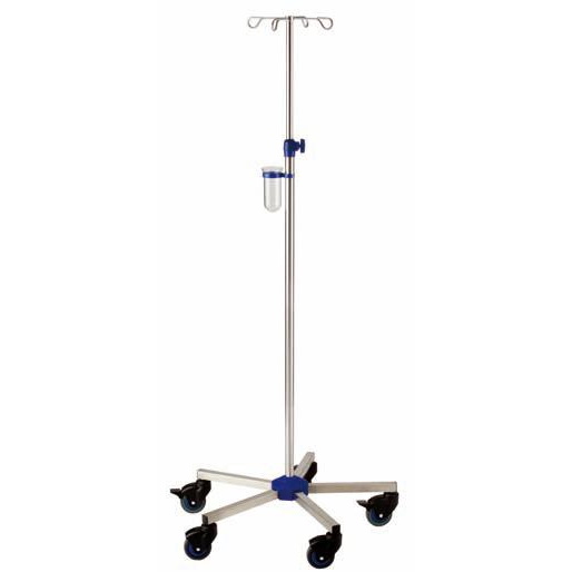 Materiał stal. Kolor części z tw. szt. niebieski. Średnica rury 25 / 18 mm. Krzyżak do butelek tworzywo szt. 4 haki - 2 kg / hak. Blokada skręcane ustawienie wysokości. Przestawienie wysokości 1.350 mm – 2.150 mm. Długość rury zewnątrznej: 1000 mm. Średnica podstawy 635 mm. Profil wysięgnika 25x25 mm. Rolki: podwójne rolki bieżne 80 mm (2 x antystatyczne & blokada, 3 x normalne). Ciężar łączny ok. 3,9/1,9 kg z kubkiem na skropliny i uchwytem.