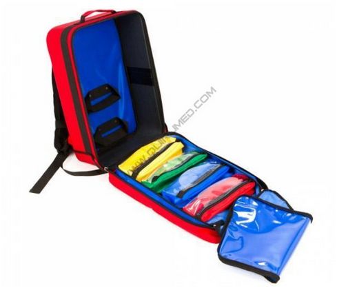 Plecak na sprzęt do tlenoterapii. Wykonany z nylonu; z zamkiem błyskawicznym; sztywna rama; pasy odblaskowe; centralne taśmy do mocowania butli tlenowej; wyjmowane kolorowe kieszenie; wyściełane taśmy naramienne.