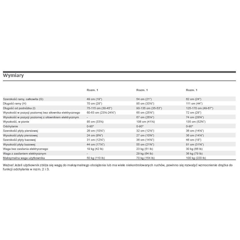 Złożone jest z szerokiej płyty bazowej i węższego podparcia u góry, aby zapewnić użytkownikowi swobodę ruchów. Posiada płytę podnóżków z regulacją i jest dostępne z manualną bądź elektryczną regulacją odchylania. Szyny zamontowane z tyłu pionizatora są przygotowane na montaż dodatkowych akcesoriów.