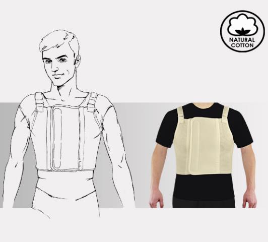 Stabilizuje zewnętrznie klatkę piersiową. Zmniejsza występujące dolegliwości bólowe i ułatwia wykonywanie koniecznych ćwiczeń oddechowych.
