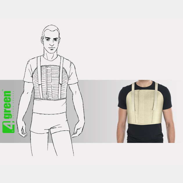 Wysoki męski pas żebrowy AM-PZM-01 został wykonany z ażurowej gumy ortopedycznej. Obejmuje on od gory żebra aż po rękojeść mostka, od dołu zaś wszystkie łuki żebrowe. Wyposażono go w przednie i tylne fiszbiny ortopedyczne, poprawiające stabilizację klatki piersiowej oraz regulowane szelki utrzymujące ortezę na właściwym miejscu. Wyrób posiada przednie zapięcie, co ułatwia pacjentowi samodzielne założenie go. Orteza stabilizuje klatkę piersiową i zmniejsza dolegliwości bólowe.