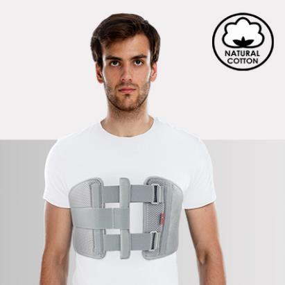 Nasz pas Torako o symbolu AM-TX-02 jest wyrobem uniwersalnym, doskonale stabilizującym klatkę piersiową i okolice mostka. W przedniej części pasa zastosowano system stabilizujących fiszbin ortopedycznych oraz aluminiową stalkę napinającą. Wyrób wykonano z surowców bawełnianych i dzięki temu może być stosowany bezpośrednio na skórę, bez ryzyka wystąpienia otarć lub odparzeń naskórka. System dopasowania rozmiaru dla danego pacjenta jest uniwersalny, polegającym na odcięciu zbędnej części wyrobu. Nieelastyczna konstrukcja wyrobu, mocne klamry poliamidowe oraz stabilne zapięcie przednie gwarantują skuteczną stabilizację pooperacyjną oraz zabezpieczają przed ewentualnym rozerwaniem rany nawet w ekstremalnych przypadkach.