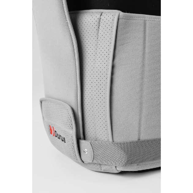 Gorset DURUS został standardowo wyposażony w wysoką ortezę lędźwiowo-piersiową w której zamontowano stalki i fiszbiny ortopedyczne. W tylnej części ortezy znajduje się regulator obwodowy, w który wpina się boki ortezy. Regulator jest przymocowany do stabilizatora kręgosłupa za pomocą zapięcia velcro, co pozwala na używanie gorsetu zarówno z ortezą jak i bez niej. Regulator obwodowy ortezy został wykonany z surowca o nazwie AirSANMED. Jest to surowiec peforowany z atestem medycznym, ułatwiającym oddychanie skóry.