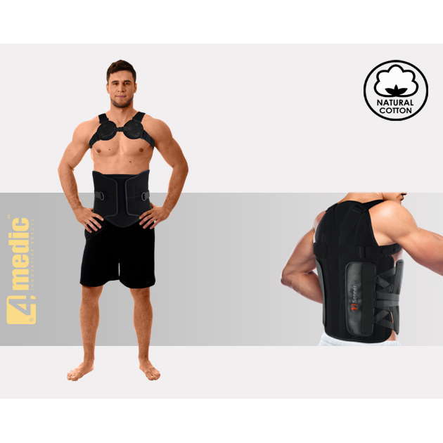 Gorset zapewnia full-obwodowe sztywne wsparcie kręgosłupa, od odcinka piersiowego (rejon łopatek T2/T3) w dół, aż do odcinka krzyżowego (S1).