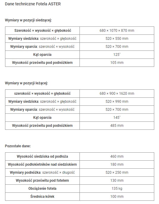 Fotel Aster w standardowej wersji posiada boczną kieszeń, którą osoba korzystająca z niego może przeznaczyć do przechowywania drobnych rzeczy. Istnieje także możliwość zamówienia kieszeni tylnej - do przechowywania pościeli.
