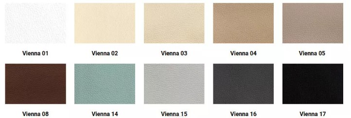 Kolory VIENNA ( skóropodobna )- są łatwe w utrzymaniu czystości, odporna na eksplotację io przenikanie cieczy - posiada dużą odporność na tarcie. Obicie jest miłe w dotyku i zapewnia cyrkulację powietrza.