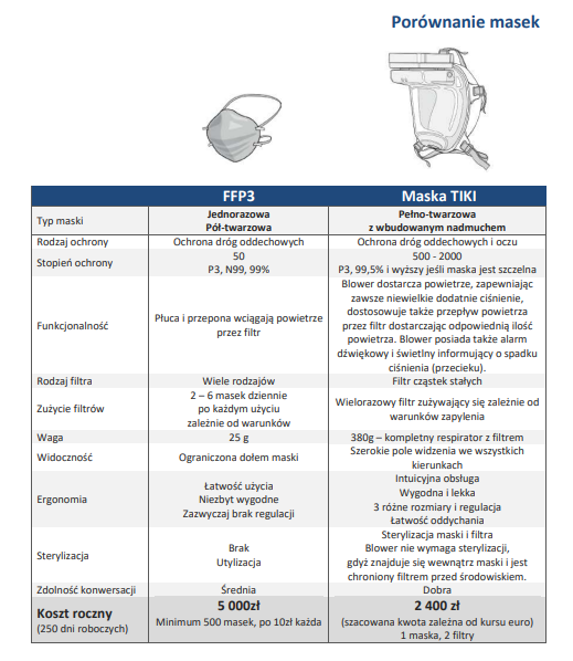 Maska TIKI jest innowacyjnym sprzętem ochronnym do wykorzystaniaw niebezpiecznych środowiskach wymagających zabezpieczenia przed lotnymi cząsteczkami i bakteriami.