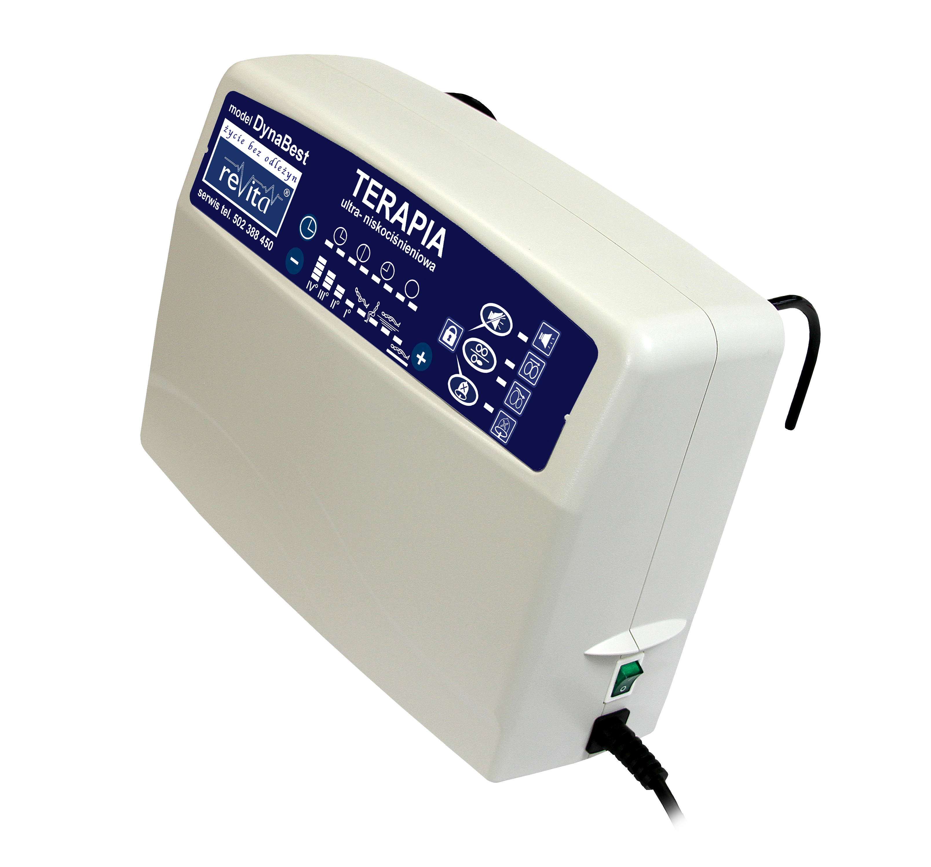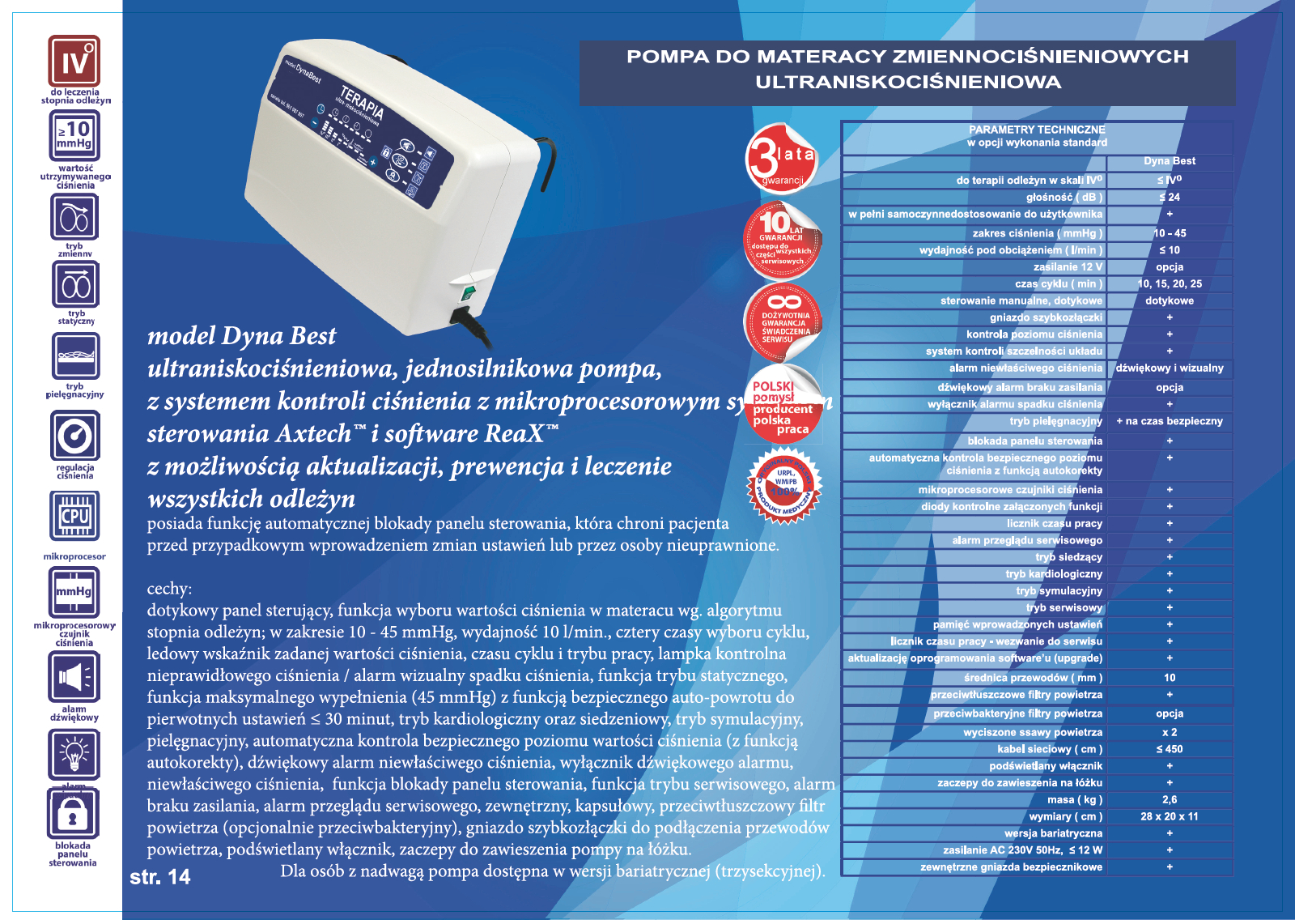 Pompa, model DynaBest: ultraniskociśnieniowa, jednosilnikowa pompa, z systemem kontroli ciśnienia z mikroprocesorowym systemem sterowania Axtech™ i software ReaX™ z możliwością aktualizacji. Profilaktyka i terapia odleżyn. Zakres ciśnienia 10- 45 mmHg. Pompa dwusekcyjna, do współpracy z materacami zmiennociśnieniowymi. Pompa posiada funkcję automatycznej blokady panelu sterowania, która chroni pacjenta przed przypadkowym wprowadzeniem zmian ustawień lub przez osoby nieuprawnione. Nastawy i regulacje oraz zmiany wartości ciśnienia dokonujemy na panelu dotykowym sterowania pompy. Funkcja wyboru czasu cyklu: 10, 15, 20, 25 minut, funkcja trybu statycznego. Automatyczne tryby: pielęgnacyjny, kardiologiczny, siedzeniowy, tryb symulacyjny. Elektroniczny system kontroli prawidłowego ciśnienia. Licznik czasu pracy z funkcją wezwania użytkownika do wykonania serwisu urządzenia- alarm przeglądu technicznego, funkcja trybu serwisowego. Wyciszona ssawa powietrza, bardzo cichy silnik ≤ 34 dB, brak wibracji, zaczepy do zawieszenia na łóżku. Filtr powietrza (przeciwtłuszczowy lub antybakteryjny).
