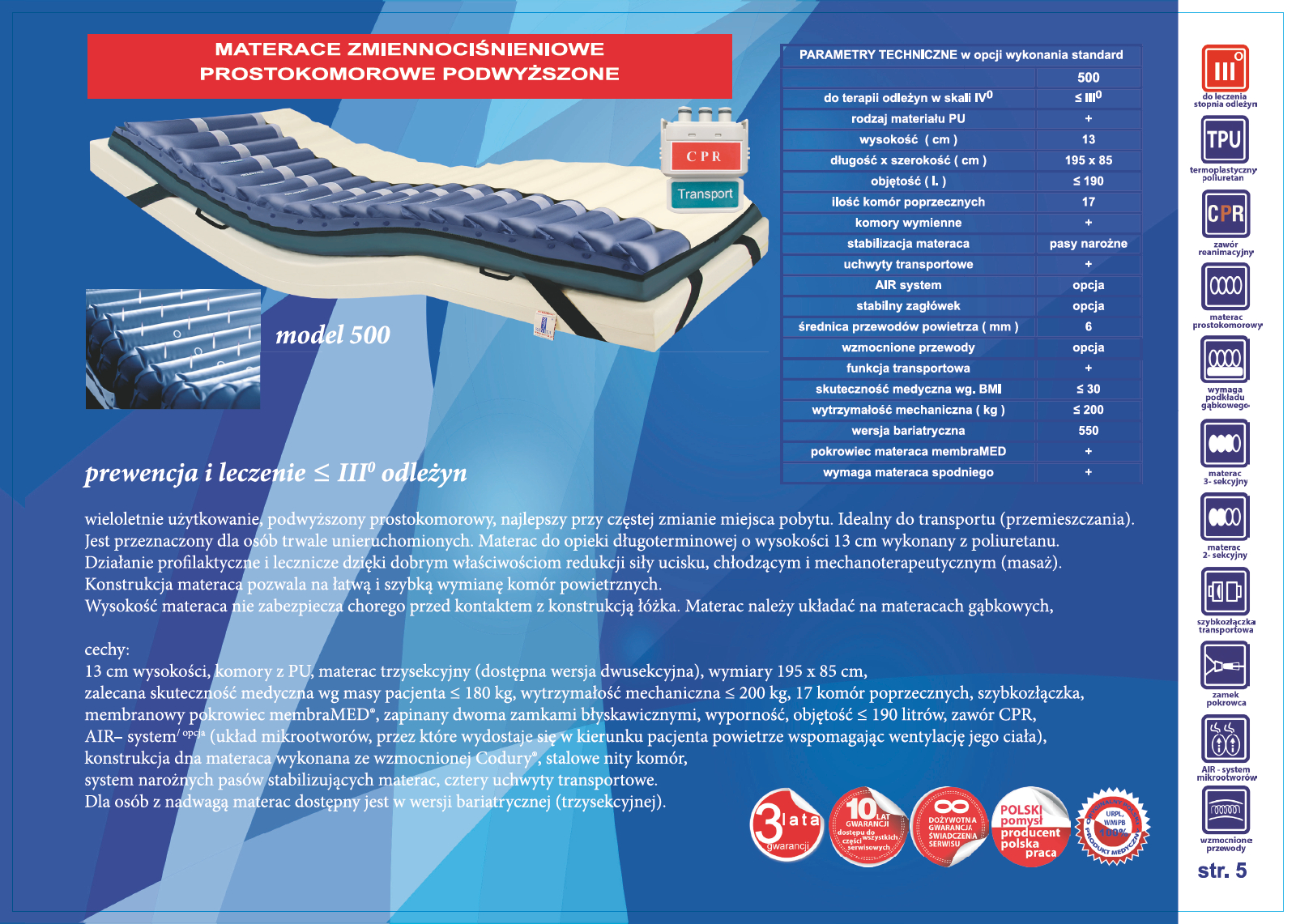 materac prostokomorowy, model 500: materac zmiennociśnieniowy do opieki długoterminowej. Podwyższony, o budowie prostokomorowej, posiada wymienne elementy. Wykonany z poliuretanu, wymiary 195 x 85 x 12,5 cm, 17 komór poprzecznych. Działanie profilaktyczne i lecznicze dzięki dobrym właściwościom redukcji siły ucisku, chłodzącym i mechanoterapeutycznym (masaż). Konstrukcja materaca pozwala na łatwą i szybką wymianę pojedynczych komór w przypadku ich uszkodzenia. Zaopatrzony w membranowy pokrowiec membraMED®, zapinany napami. Materac należy układać na materacach piankowych. Zdjęcie przedstawia dodatkowy materac spodni.