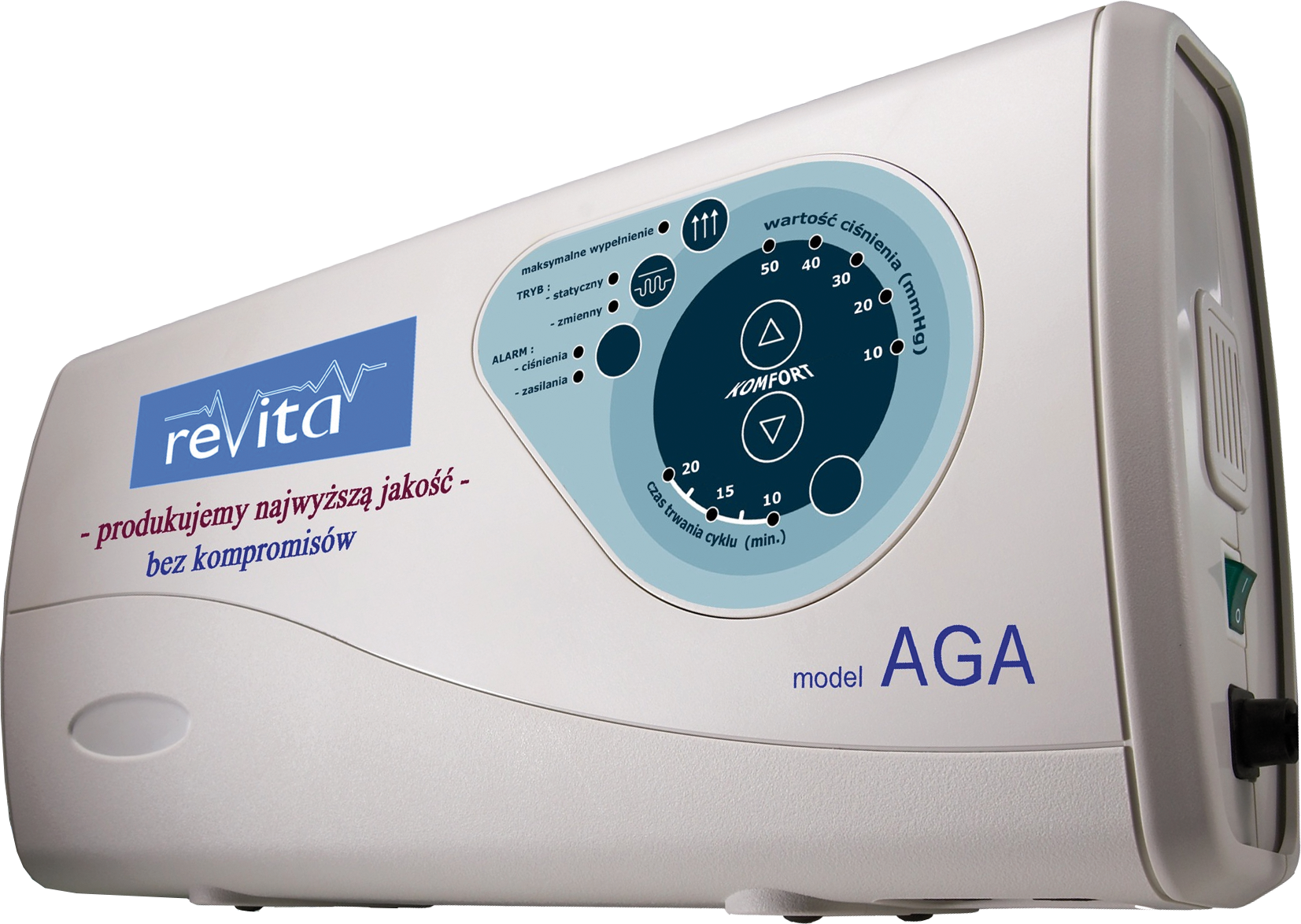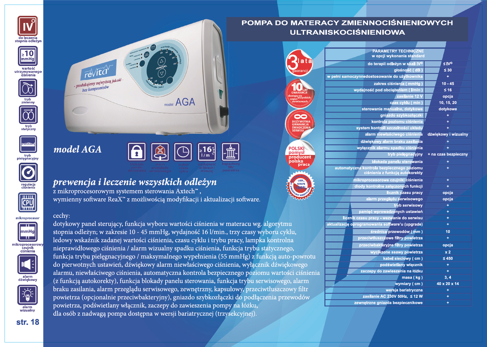 Pompa, model Aga: ultraniskociśnieniowa, dwusilnikowa pompa z mikroprocesorowym systemem sterowania Axtech™ i software ReaX™ z możliwością aktualizacji. Profilaktyka i terapia odleżyn. Pompa dwusekcyjna, dwusilnikowa do współpracy z materacami zmiennociśnieniowymi prostokomorowymi. Panel sterujący, wraz z sygnalizacją wskazującą niewłaściwą pracę pompy. Sterowanie za pomocą panelu sterowania. Zakres ciśnienia 10- 50 mmHg. wydajność 18 l/min. Pompa posiada funkcję automatycznej blokady panelu sterowania, która chroni pacjenta przed przypadkowym wprowadzeniem zmian ustawień lub przez osoby nieuprawnione. Nastawy i regulacje oraz zmiany wartości ciśnienia dokonujemy na panelu dotykowym sterowania pompy. Funkcja wyboru czasu cyklu: 10, 15, 25 minut, funkcja trybu statycznego. Automatyczny tryb pielęgnacyjny. Elektroniczny system kontroli prawidłowego ciśnienia. Alarm braku zasilania. Wyciszona ssawa powietrza, bardzo ciche silniki ≤ 34 dB, brak wibracji, zaczepy do zawieszenia na łóżku. Filtr powietrza (przeciwtłuszczowy lub antybakteryjny). Zakres masy pacjenta ≤ 260 kg.