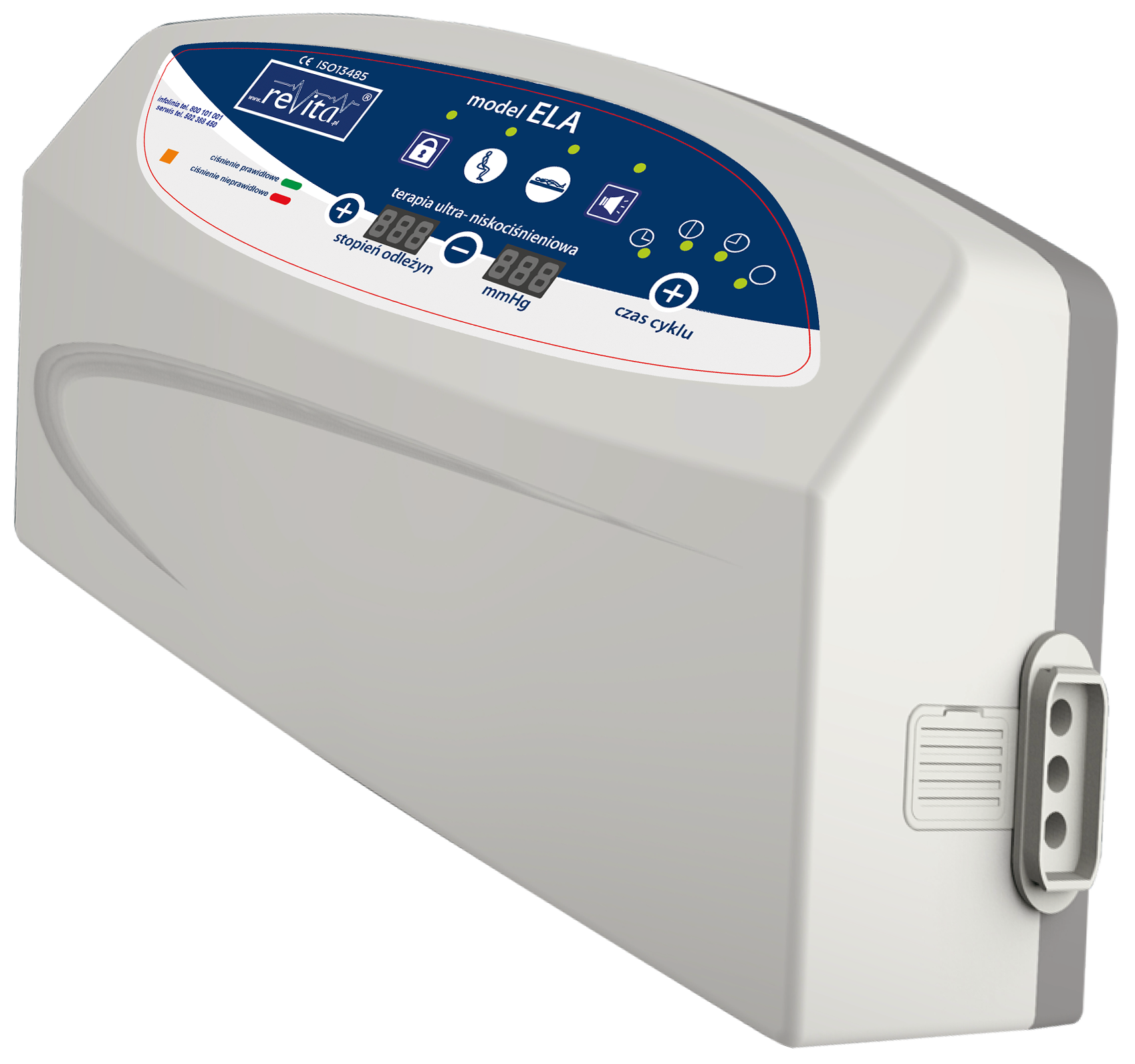 Pompa model Ela, ultraniskociśnieniowa, dwusilnikowa pompa z systemem kontroli ciśnienia, dwa wyświetlacze LED, pompa 3- sekcyjna, z elektronicznym systemem kontrolnym. Pompa dwusilnikowa. Panel sterujący, wraz z sygnalizacją wskazującą niewłaściwą pracę pompy. Sterowanie za pomocą panelu sterowania (dotyk palca, rysika pojemnościowego) lub pilota bezprzewodowego. Zakres ciśnienia 10- 40 mmHg. wydajność 14 l/min. Pompa posiada wybór wartości ciśnienia, dokonywany automatycznie (wg. algorytmu masa ciała – wartość ciśnienia), wyświetlacz LED wskazujący podany stopień odleżyn, drugi aktualnie utrzymywaną wartość ciśnienia w materacu. Pompa posiada funkcję automatycznej blokady panelu sterowania, która chroni pacjenta przed przypadkowym wprowadzeniem zmian ustawień lub przez osoby nieuprawnione. Nastawy i regulacje oraz zmiany wartości ciśnienia dokonujemy na panelu dotykowym sterowania pompy. Funkcja wyboru czasu cyklu: 10, 15, 20, 25 minut, funkcja trybu statycznego. Automatyczne tryby: pielęgnacyjny, siedzeniowy. Elektronicznym system kontroli prawidłowego ciśnienia. Alarm braku zasilania. Wyciszone ssawy powietrza, dwa aluminiowe, bardzo ciche silniki ≤ 20 dB, z zawieszeniem przeciwrotacyjnym – brak wibracji, zaczepy do zawieszenia na łóżku. Zakres masy pacjenta ≤ 260 kg.