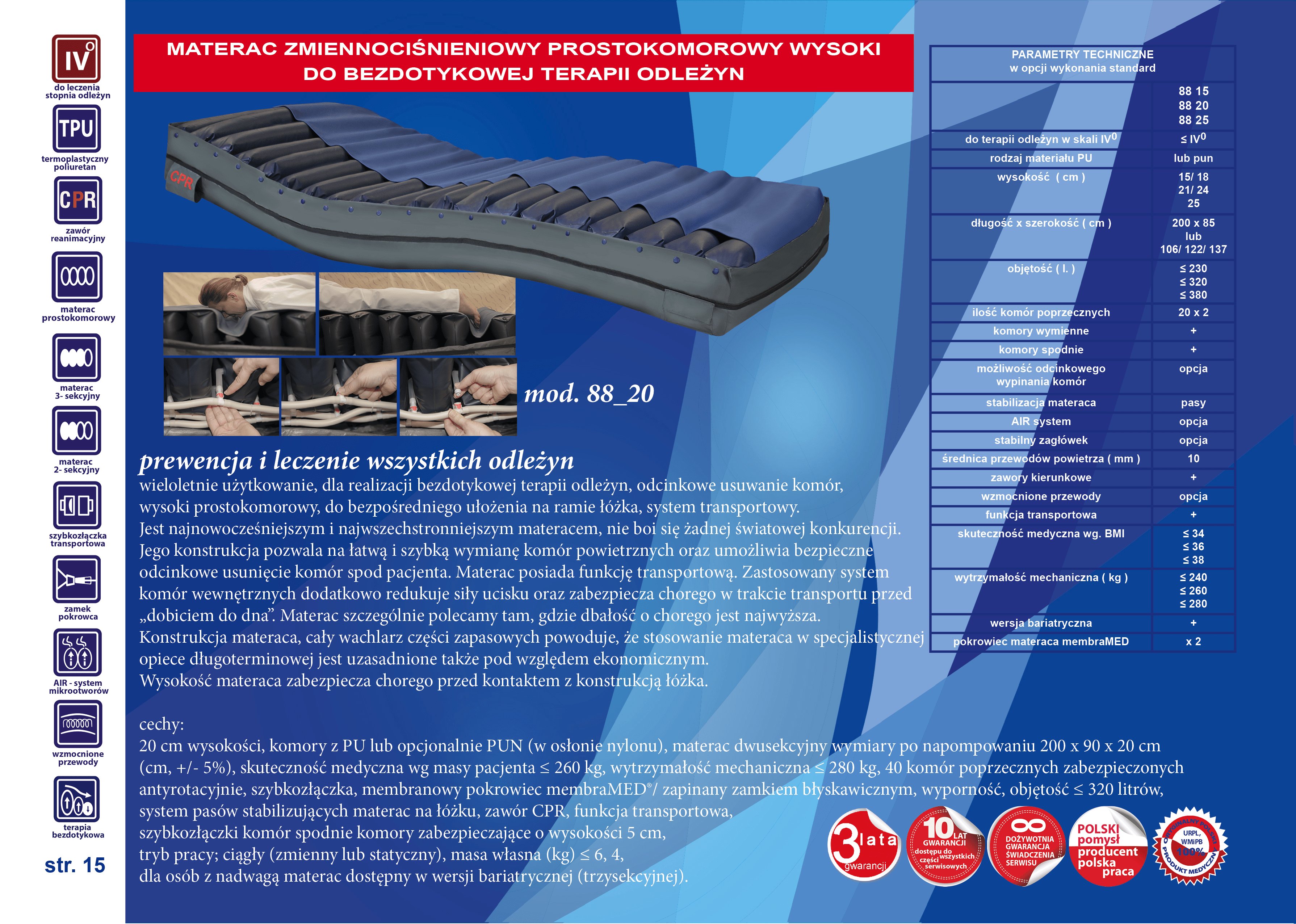 - zastosowany system komór wewnętrznych dodatkowo redukuje siły ucisku oraz zabezpiecza chorego w trakcie