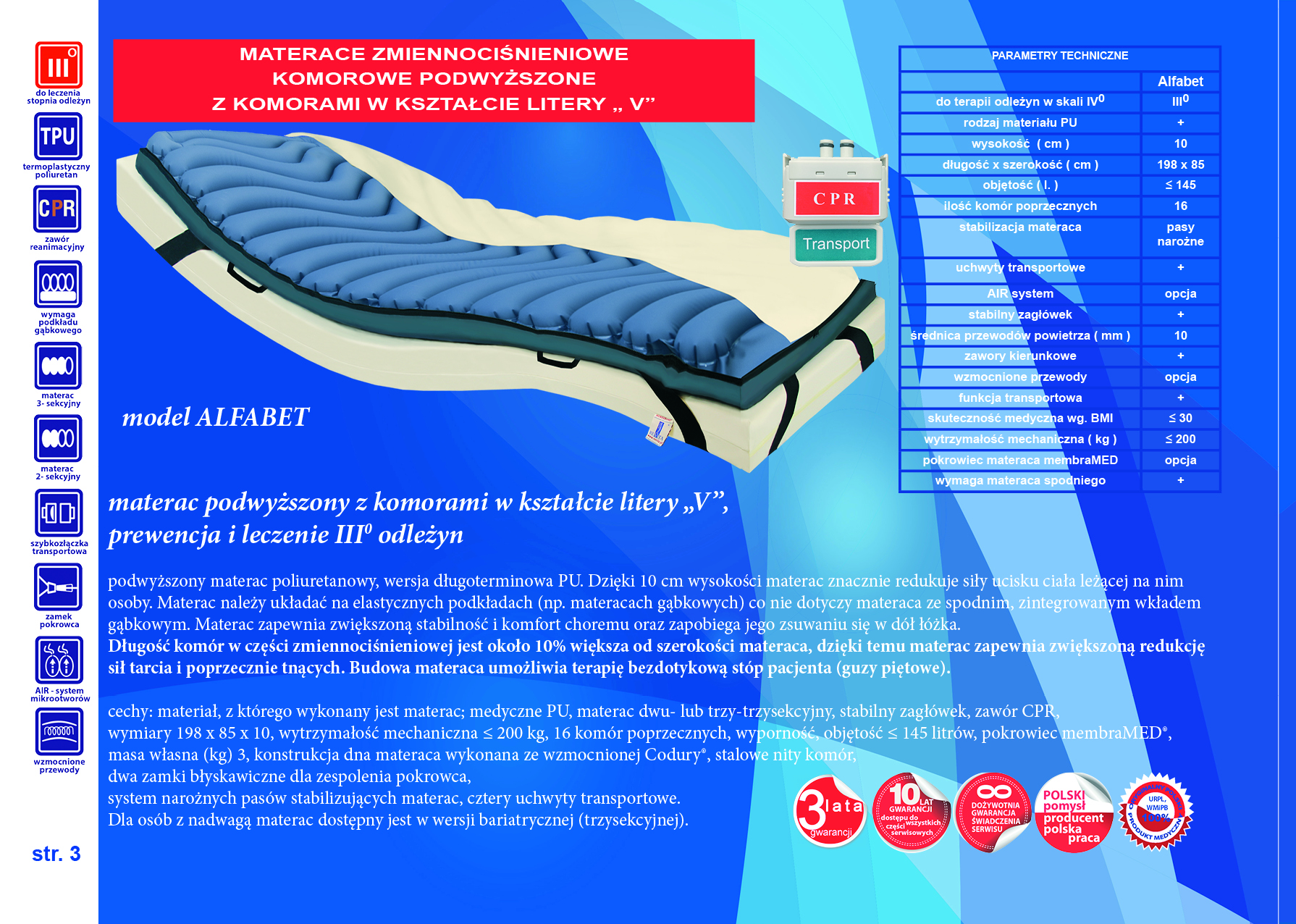 materac, model Alfabet: materac z komorami o kształcie falistym. Zaprojektowany dla osób przebywających w pozycjach „półsiedzących” (np. kardiologia, pulmonologia). Materac podwyższony z komorami w kształcie litery V, zmiennociśnieniowy do opieki długoterminowej. Wykonany z medycznego PU. Dzięki 10 cm wysokości materac znacznie redukuje siły ucisku ciała leżącej na nim osoby. Materac należy układać na elastycznych podkładach (np. materacach gąbkowych). Zapewnia zwiększoną stabilność i komfort choremu oraz zapobiega jego zsuwaniu się w dół łóżka. Długość komór w części zmiennociśnieniowej jest około 10% większa od szerokości materaca dzięki temu materac zapewnia zwiększoną redukcję sił tarcia i poprzecznie tnących. Wymiary 196 x 85 x 10 cm, 16 komór poprzecznych, wyłogi stabilizujące, pokrowiec membraMED®, szybkozłączka transportowa. Zdjęcie przedstawia dodatkowy materac spodni.
