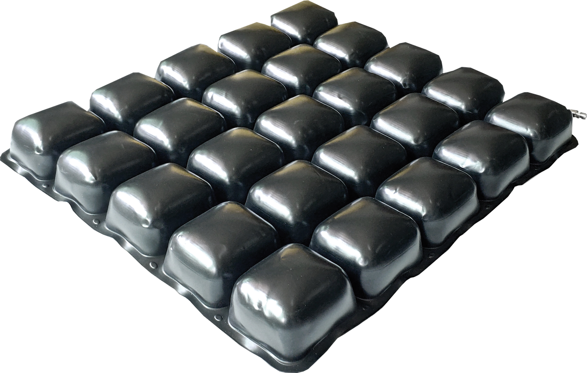 Siedzeniową poduszkę zmiennociśnieniową tworzy zespół połączonych ze sobą komór zbudowanych z tzw. wypustków- baniek wypełnionych powietrzem lub tzw. komór prostych. Komory poduszki są ze sobą połączone naprzemiennie tworząc dwie odrębnie, naprzemiennie zasilane przez pompę zmiennociśnieniową sekcje powietrza. Działanie poduszek siedzeniowych jest takie same jak w przypadku materacy zmiennociśnieniowych. Napełnianie poduszki powietrzem wykonywane jest automatycznie przez pompę, która jest połączona z poduszką przewodami powietrza. Pompa, samoczynnie i precyzyjnie reguluje ciśnienie powietrza w poduszce (zgodnie z wybranym przez użytkownika trybem pracy). W poduszce automatycznie utrzymywana jest wybrana przez użytkownika wartość ciśnienia oraz czas trwania ucisku- cyklu. Poduszka składa się z dwóch głównych komór powietrznych, które automatycznie współpracują ze sobą przy nabieraniu i wypuszczaniu powietrza. Z chwilą wypuszczania powietrza tworzą się pod pacjentem tunele powietrzne. Gdy pompa usuwa powietrze z sąsiadujących komór siła pozostałych komór unosi ciało pacjenta na tyle wysoko, że zasysa pod niego powietrze tworząc efekt miecha powietrznego. Wymusza to przepływ powietrza, które wentyluje skórę chorego. Ciało nie przegrzewa się i nie poci, a skóra pozostaje sucha. Poduszka wspomaga pracę układu krwionośnego zwiększając przepływ krwi w naczyniach włosowatych uciskanych tkanek.