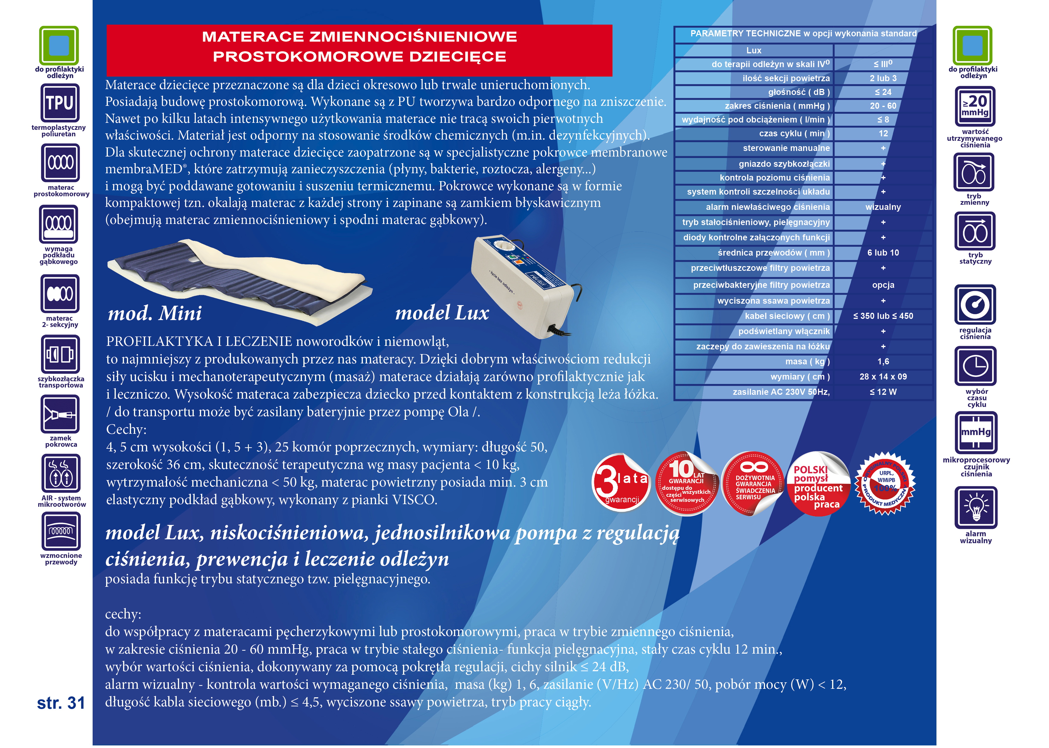 materac prostokomorowy, zmiennociśnieniowy do opieki długoterminowej. Najmniejszy z produkowanych przez nas materacy. 25 komór poprzecznych. Przeznaczony jest dla noworodków i niemowlaków, dzieci okresowo lub trwale unieruchomionych. Dzięki dobrym właściwościom redukcji siły ucisku i mechanoterapeutycznym (masaż) materace działają zarówno profilaktycznie, leczniczo jak i stymulująco. Wykonany z medycznego PU. Materiał jest odporny na stosowanie środków chemicznych (m.in. dezynfekcyjnych). Dla skutecznej ochrony materace zaopatrzone są w specjalistyczne pokrowce membranowe membraMED®, które zatrzymują zanieczyszczenia (płyny, bakterie, roztocza, alergeny…) i mogą być poddawane gotowaniu i suszeniu termicznemu. Pokrowce okalają materac z każdej strony i zapinane są zamkiem błyskawicznym (obejmują materac zmiennociśnieniowy i spodni materac gąbkowy). Wysokość materaca zabezpiecza dziecko przed kontaktem z płaską konstrukcją leża łóżka.