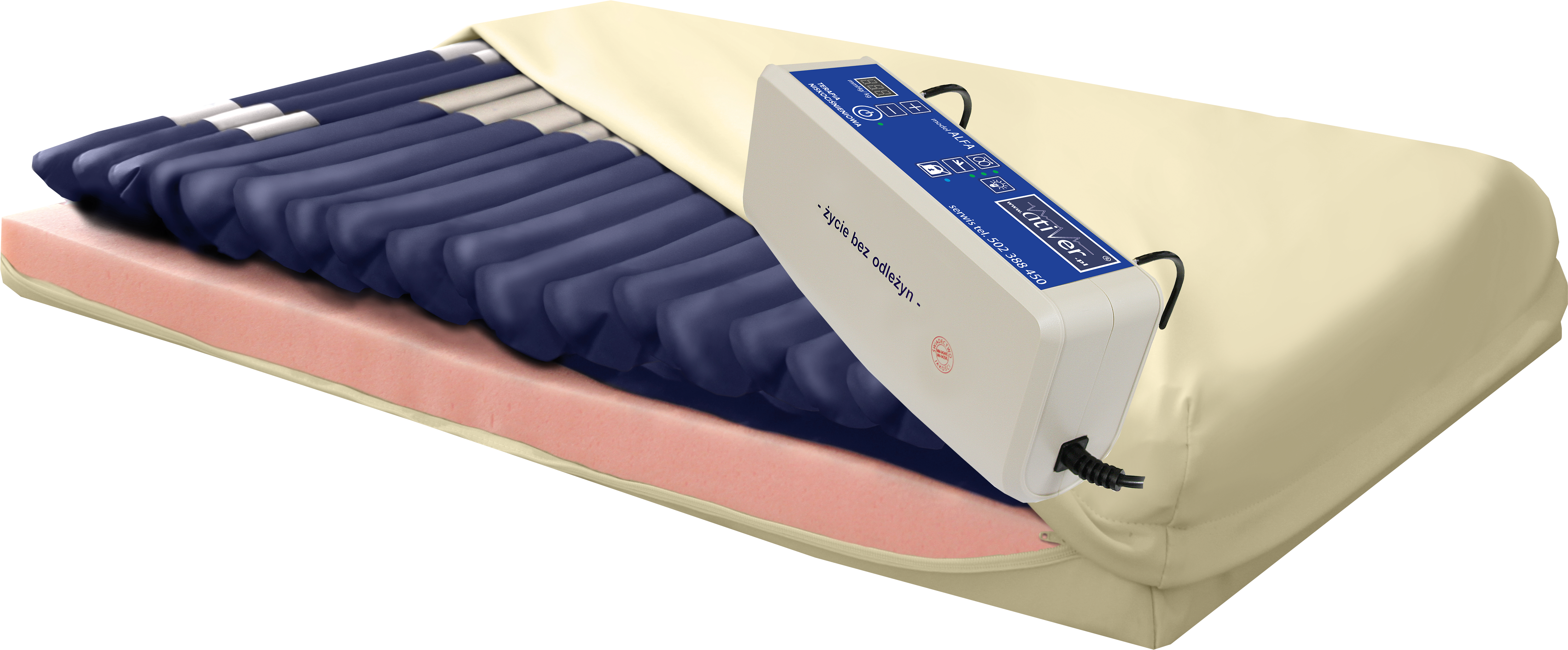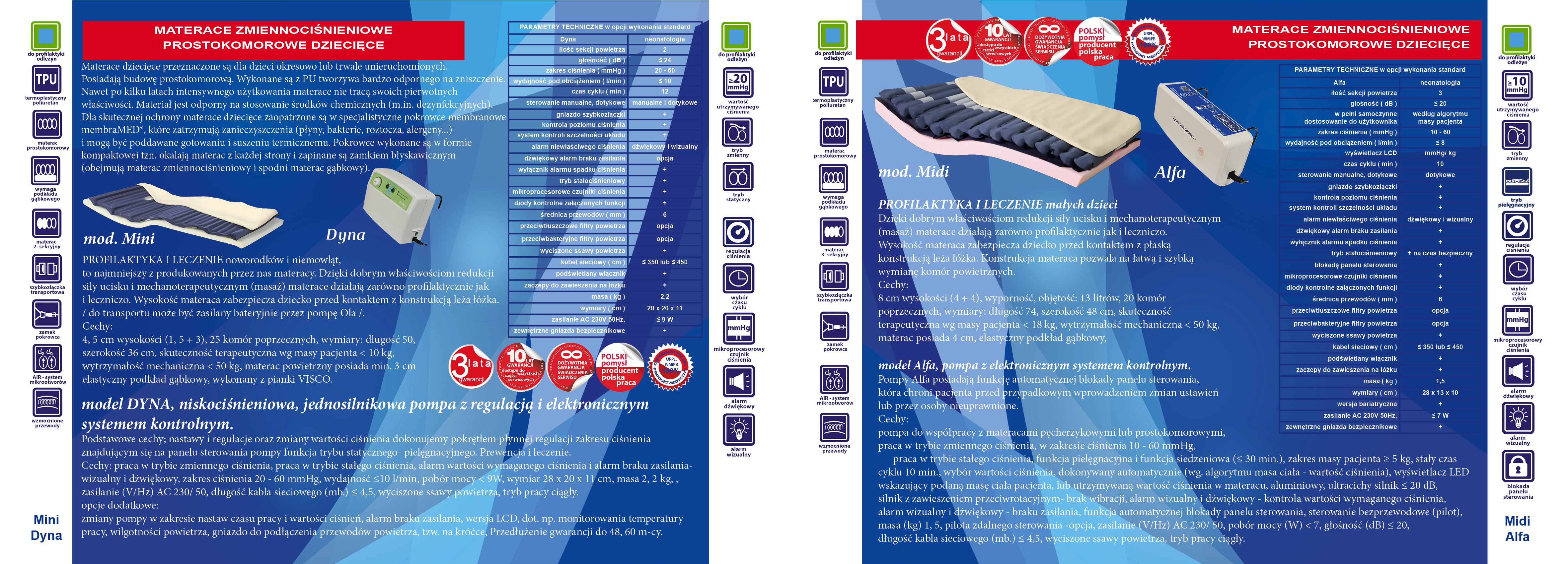 Profilaktyka i leczenie noworodków i niemowląt, to najmniejszy z produkowanych przez nas materacy. Dzięki dobrym właściwościom redukcji siły ucisku i mechanoterapeutycznym (masaż) materace działają zarówno profilaktycznie, jak i leczniczo. Wysokość materaca zabezpiecza dziecko przed kontaktem z konstrukcją leża łóżka. Do transportu może być zasilany bateryjnie przez pompę Ola.