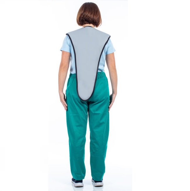 Ochronny fartuch stomatologiczny, pantomograficzny RTG. Zabezpiecza przód, barki i kręgosłup przed promieniowaniem rentgenowskim. Fartuch jest zapinany z przodu na zakładkę za pomocą taśmy na rzep.