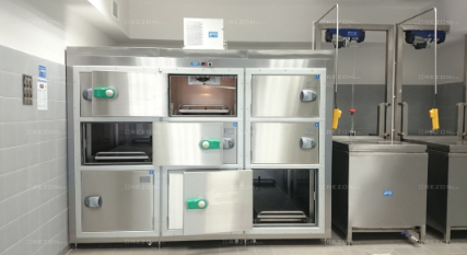 - Zastosowanie do budowy komory, jak również jej wyposażenia materiałów nierdzewnych – kwasoodpornych pozwala na użycie szerokiej gamy systemów do dezynfekcji komór. Przykładowo można zastosować tradycyjny system natrysku środkami chemicznymi lub innowacyjny system aktywnej mgły (mikrodyfuzja)
