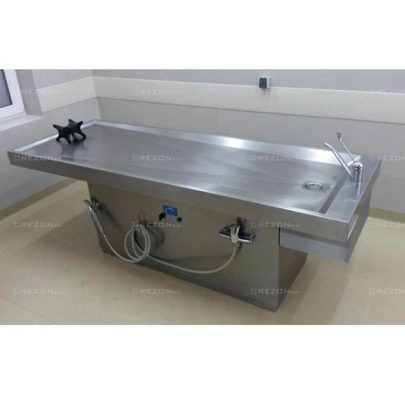 Stół wykonany jest w całości z wysokogatunkowej stali nierdzewnej – kwasoodpornej, dodatkowo blat roboczy stołu może być wykonany ze stali utwardzonej o podwyższonych parametrach ścieralności. Stół przeznaczony jest do toalety pośmiertnej oraz ubierania zwłok. Stół wyposażony jest w blat roboczy ze zlewozmywakiem, komplet baterii lekarskich do pracy przy blacie roboczym oraz zlewie, posiada również kompletne przyłącza wodno kanalizacyjne.