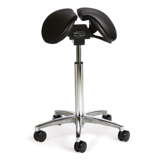 Krzesło o kształcie siodła. Doskonałe dla obu płci, wyposażone w dwuczęściowe siedzisko bez regulacji szerokości szczeliny pomiędzy częściami siedziska. Najwyższej jakości naturalna skóra. Chromowany lub czarny pneumatyczny cylinder.