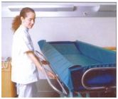 materac PCV z napięciami do odpływu płynów, poduszka w kształcie trapezoidalnym oraz specjalny wąż odpływowy.