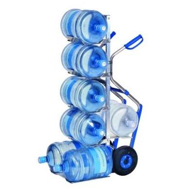 - Wózki przeznaczone do transportu wody mineralnej w galonach wyposażyliśmy w specjalne rozkładane półki, które umożliwiają bezpieczne ułożenie galonów. Dolna półka mieści dwa galony, a kolejne cztery pojedyncze półki zapewniają stabilne oparcie dla pozostałych.