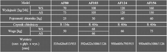 Wytwornice lodu płatkowanego (granulowanego) z wbudowanym zbiornikiem, produkują lód w swej najbardziej naturalnej formie, wytworzony w temperaturze tuż poniżej zera stopni Celsjusza, który zawiera 25% wody, dzięki czemu jest bardzo wilgotny. Jego kształt sprawia, że jest niesamowicie wszechstronny i łatwy w skutecznym użyciu, odpowiedni do zastosowań w celach medycznych oraz laboratoryjnych. Urządzenia występują w dwóch wersjach - ze skraplaczem chłodzonym wodą (WS) lub powietrzem (AS), są z grawitacyjnym odpływem skroplin. Dostępny jest model AF80M wytwarzający lód z wody demineralizowanej.