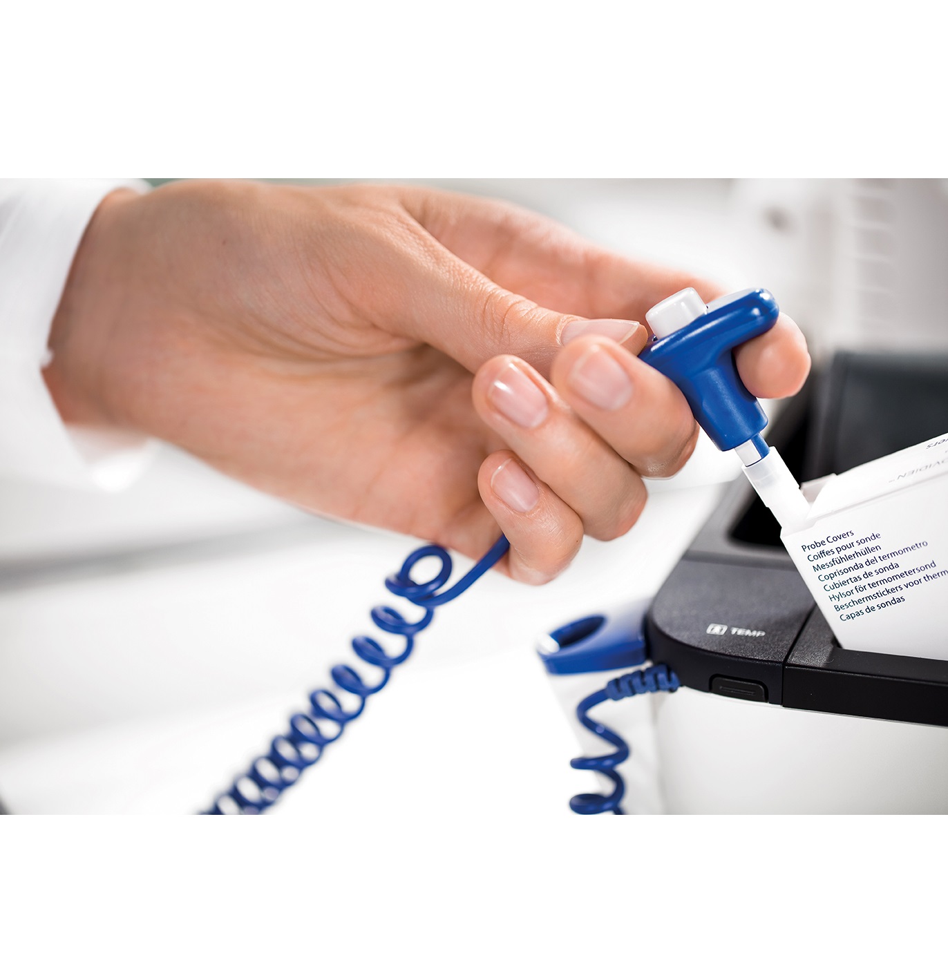 Termometr douszny lub opcjonalnie do wyboru końcówki do pomiaru temperatury w jamie ustnej, pod pachą lub w odbycie |
