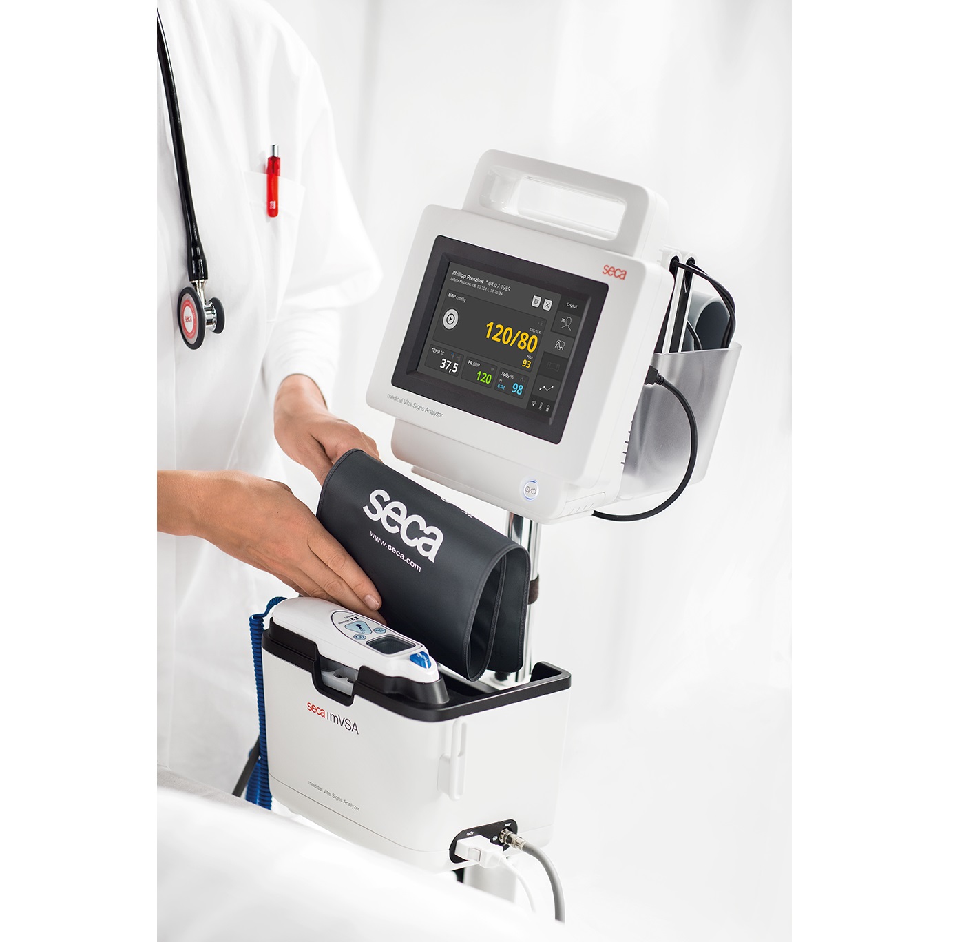 Aparat seca mVSA 535 to pierwszy na świecie monitor typu „spot-check”, łączący możliwość pomiaru parametrów życiowych oraz prowadzenia analizy impedancji bioelektrycznej (BIA). W jednym etapie pozwala ocenić cztery parametry życiowe: ciśnienie tętnicze, SpO2, tętno, temperatura) oraz oznaczyć skład ciała (zawartość wody w organizmie, masa tkanki tłuszczowej, masa tkanki mięśniowej). W trakcie rutynowej kontroli pozwala zmierzyć więcej parametrów oraz poprawić Państwa możliwości diagnostyczne i terapeutyczne poprzez skojarzone przedstawienie wyników analizy BIA i parametrów życiowych. Wydajne oprogramowanie łączy się z każdą siecią i zapewnia bezbłędne przekazanie wyników pomiarowych do stosowanego przez Państwa systemu elektronicznej dokumentacji medycznej. W razie potrzeby nasza usługa integracyjna pomoże zintegrować system z Państwa strukturą informatyczną, co pozwoli zoptymalizować proces rutynowych pomiarów wykonywanych każdego dnia. Aparat seca mVSA należy do serii produktów bezprzewodowych seca 360° wireless i zapewnia automatyczne przekazywanie informacji dotyczących wzrostu i masy ciała z kompatybilnych wag i systemów pomiarów długości (wysokości) ciała do urządzenia. Aparat automatycznie wylicza wartość wskaźnika BMI.