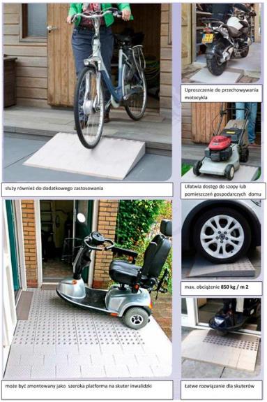 Oczywiście rampa może być używana do wszystkich urządzeń kołowych takich jak rowery i motocykle, kosiarki, taczki powyżej progu domu lub garażu.