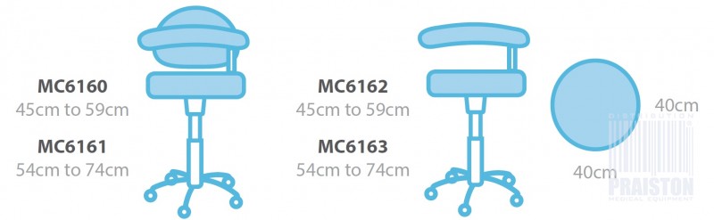 - MC6160 - Zakres regulacji wysokości 45 – 59 cm, Krzesło wyposażone w oparcie i ramię,