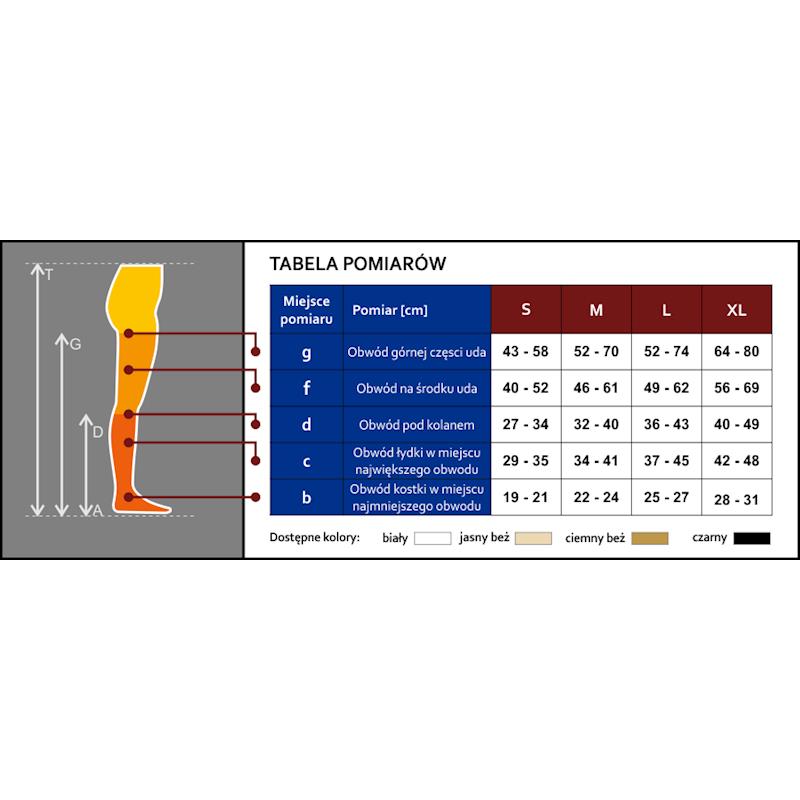 Wielkość ucisku mierzona w milimetrach słupka rtęci (mmHg) dla 1 stopnia ucisku wynosi: 15 - 21 mmHg. Rajstopy produkowane są w wersji z czubkiem zamkniętym. Dostępne w wersji krótkiej oraz długiej.