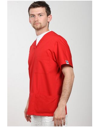 Bluza medyczna firmy Skelt jest wykonana z materiału najwyższej jakości, spełniającego wszystkie normy stawiane tkaninie medycznej (PN-P-84525, PN-90/P-82008, PN-EN 340). Gramatura 170g/m sprawia, że odzież jest lekka i nie powoduje uczucia zmęczenia nawet po całym dniu użytkowania, a skład 50% bawełna/50% poliester zapewnia przewiewność w ciepłe dni. Dzięki płóciennemu splotowi odzież jest niegniotąca oraz wytrzymała na uszkodzenia mechaniczne. W celu otrzymania trwałości koloru tkanina barwiona jest w wysokiej temperaturze, co pozwala na jednoczesne uzyskanie najniższej kurczliwości (2% w praniu o temp. 95°C). Bluza stębnowana pojedynczo nicią w kolorze tkaniny, posiadająca 5 wyjątkowo pojemnych kieszeni, których objętość przekracza 2l. Trzy przednie kieszenie są idealne na długopisy, latarkę i recepty, podczas gdy dwie tylne bez problemu pomieszczą stetoskop z futerałem i "małego Szczeklika". Dekolt w szpic, boczne pęknięcia oraz krótki rękaw umożliwia swobodne ruchy, nie tracąc na fasonie.
