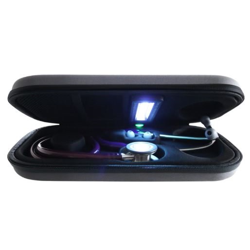 Przeciwdrobnoustrojowe etui na stetoskop automatycznie rozpoczyna kilkunastoekundowy proces dezynfekcji w momencie zamknięcia, sygnalizuje zakończenie sterylizacji sygnałem dźwiękowym. Dezynfekcja stetoskopu zachodzi w procesie naświetlania promieniowaniem ultrafioletowymi UV-C. Proces dezynfekcji nie nagrzewa narzędzia.