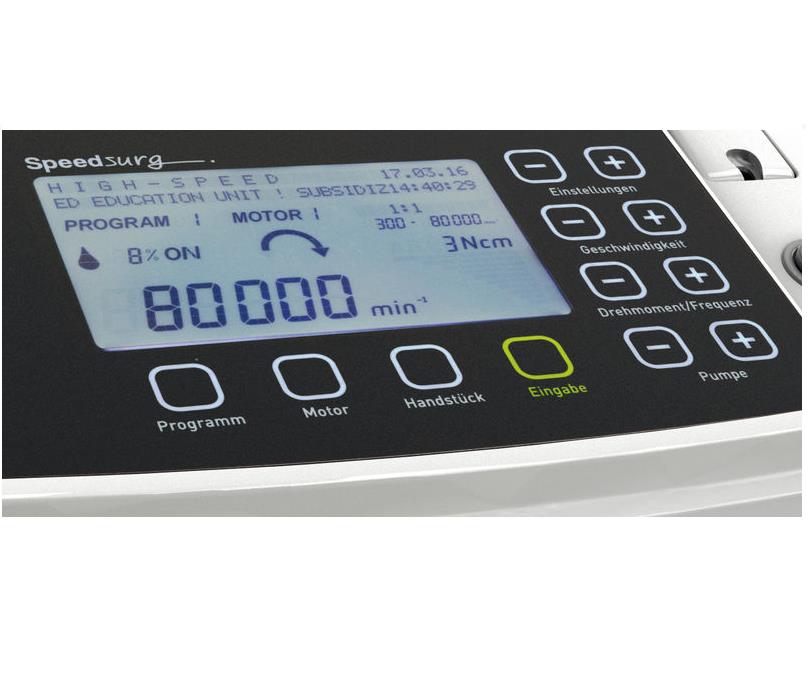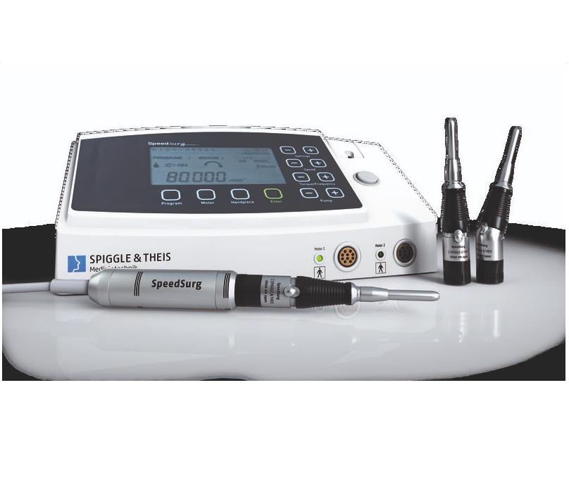 SpeedSurg - wiertarka wysokoobrotowa najnowszej generacji niemieckiej firmy Spiggle&Theis. Wszytkie elementy zostały zaprojektowane i wyprodukowane tak, aby zapewnić maksymalny komfort pracy chirurga. Mikromotor oraz rączki wysokoobrotowe posiadają unikatowy system SecureLock oraz QuickRelease, które gwarantują bezwibracyjną, płynną i wpełni bezpieczną pracę elementów wysokoobrtowych. SpeedSurg ma wbudowaną pompę perystaltyczną oraz nożny regulator parametrów pracy. Rozbudowane MENU pozwala na zmianę wielu parametrów i personalizację ustawień. System może być wyposażony w wiertła jedno- oraz wielorazowe oraz kompletny system do mycia i sterylizacji wszystkch elementów roboczych.