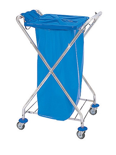 Wózek na odpady. Wyposażenie standardowe:1. konstrukcja wózka chromowana KONS-0021, 2. worek 120 l niebieski WORE-0002, 3. 5 x zapinka worka ZAPI-0001, 4. pokrywa worka 120 l niebieska POKR-0017. 1szt./1 paczka (650x150x1200 mm). Waga: netto - 8,2 kg, brutto - 9 kg. 10 szt./1 paleta (800x1200 mm).