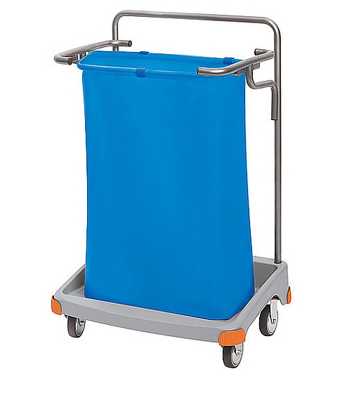 Pojedynczy wózek na odpady z tworzywa sztucznego. Wyposażenie standardowe: 1. podstawa L TS PODS-0019, 2. 2 x odbojnik zestawu TS ODB-0001, 3. 2 x odbojnik zestawu TS ODB-0002, 4. rurka – ramka główna RURK-0034, 5. rurka worka z podpórkami RURK-0042, 6. 2 x kółko 100 mm z płytką mocującą KOLK-0006, 7. 2 x kółko 100 mm z płytką mocującą stałe KOLK-0011, 8. 5 x zapinka worka ZAPI-0001, 9. worek 120 l niebieski WORE-0002. 1szt./1 paczka (870x590x410 mm). Waga: netto - 8,8 kg, brutto - 11,2 kg. 8 szt./1 paleta (800x1200 mm).