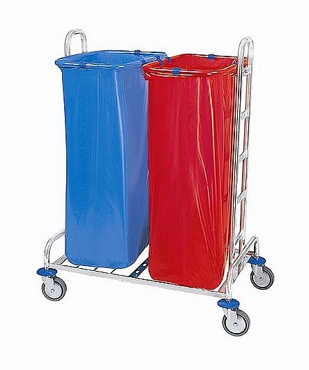 Wózek na odpady. Wyposażenie standardowe: 1. podstawa pod zestaw 3500 PODS-0010, 2. 2 x ramka pionowa 3501 RAMK-0008, 3. ramka 2x120 350130 C RAMK-0014, 4. worek 120 l niebieski WORE-0002, 5. worek 120 l czerwony WORE-0001, 6. 10 x zapinka worka ZAPI-0001. 1szt./1 paczka (1030x550x300 mm). Waga: netto - 11,8 kg, brutto - 13,2 kg. 6 szt./1 paleta (800x1200 mm).