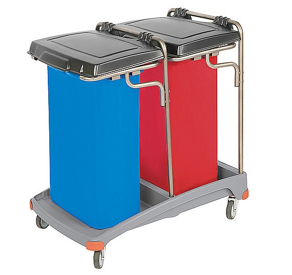 Podwójny wózek na odpady z tworzywa sztucznego. Wyposażenie standardowe: 1. podstawa XL TS PODS-0020 , 2. 2 x odbojnik nr 1 zestawu TS ODB-0001, 3. 2 x odbojnik nr 2 zestawu TS ODB-0002,4. 2 x rurka – ramka główna RURK-0034, 5. 2 x rurka worka z podpórkami RURK-0042,