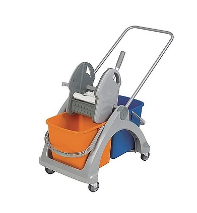 Wózek z tworzywa sztucznego pomarańczowo/niebieski. Wyposażenie standardowe: 1. konstrukcja podwójnego wózka z tworzywa sztucznego kompletna KONS-0025, 2. rączka aluminiowa RURK-0005,